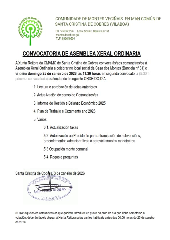 Asemblea Xeral de comuneiras/os 2026 Convócase para o vindeiro domingo 25 de xaneiro de 2026, ás 11:30 horas na Casa dos Montes de Santa Cristina